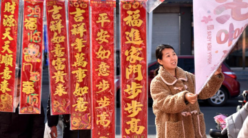 2月12日,人们在河南省焦作市温县的一处集市上选购春联。