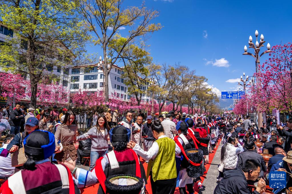 3月26日在丽江市雪山路拍摄的长街宴活动现场(无人机照片)。