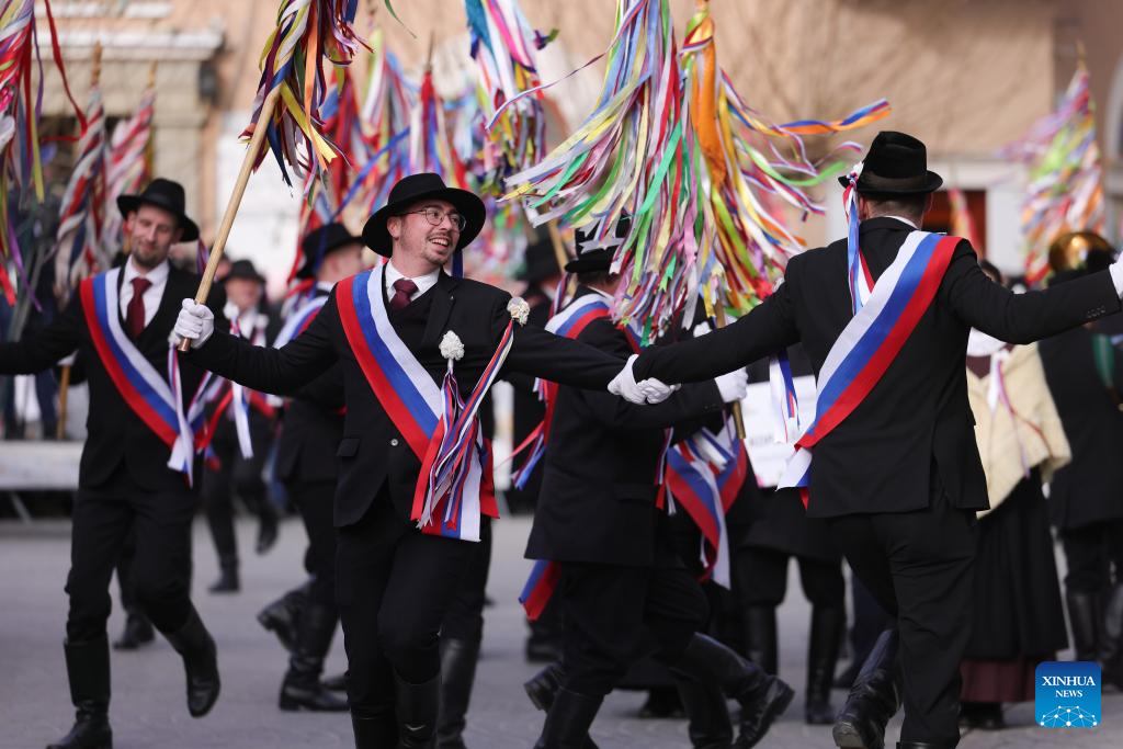 Women dressed as gipsies present themselves at a masquerade parade during the international carnival festival in Ptuj, Slovenia, Feb. 15, 2026. (Photo by Zeljko Stevanic/Xinhua)