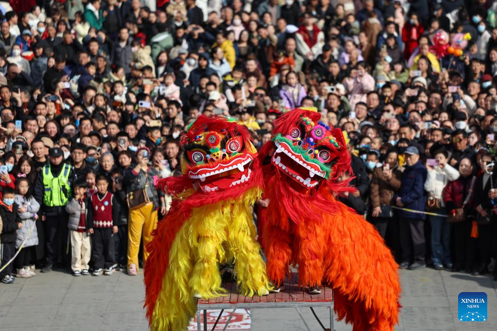 People watch a lion dance performance in Lanzhou, northwest China's Gansu Province, Feb. 18, 2026. During the Spring Festival, various folk activities and performances are held across China. (Photo by Hou Chonghui/Xinhua)