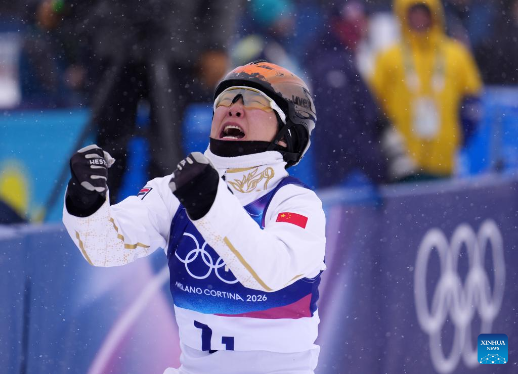 Wang Xindi of China reacts during the freestyle skiing mixed team aerials final 1 at the Milan-Cortina 2026 Olympic Winter Games in Livigno, Italy, Feb. 21, 2026. (Xinhua/Wang Peng)