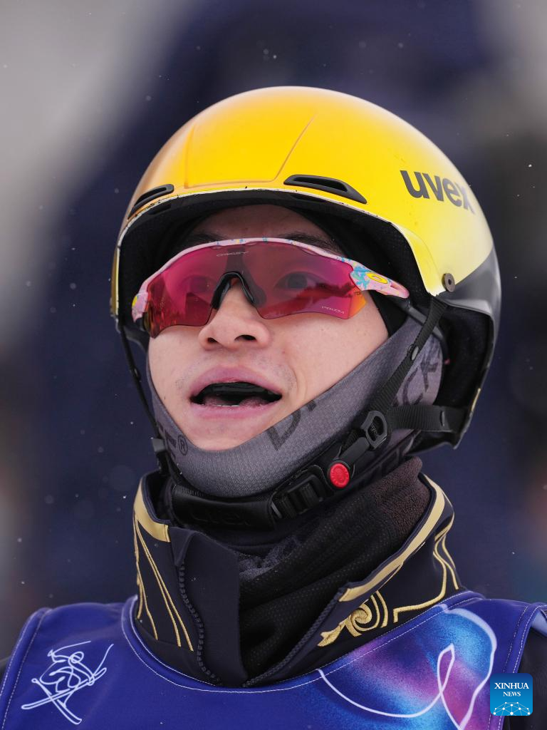 Xu Mengtao of China reacts during the freestyle skiing mixed team aerials final 1 at the Milan-Cortina 2026 Olympic Winter Games in Livigno, Italy, Feb. 21, 2026. (Xinhua/Wang Peng)
