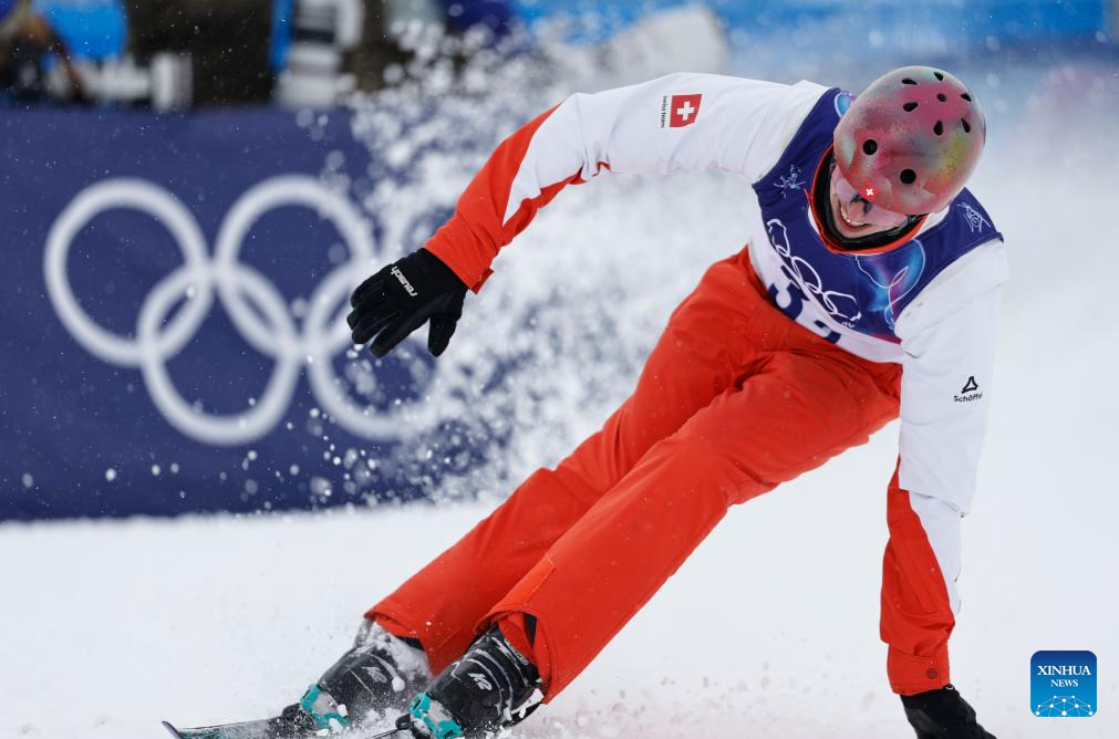 Pirmin Werner of Switzerland competes during the freestyle skiing mixed team aerials final 1 at the Milan-Cortina 2026 Olympic Winter Games in Livigno, Italy, Feb. 21, 2026. (Xinhua/Wang Peng)