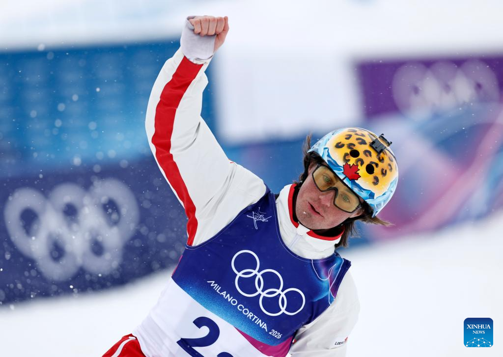 Miha Fontaine of Canada reacts during the freestyle skiing mixed team aerials final 1 at the Milan-Cortina 2026 Olympic Winter Games in Livigno, Italy, Feb. 21, 2026. (Xinhua/Wang Peng)