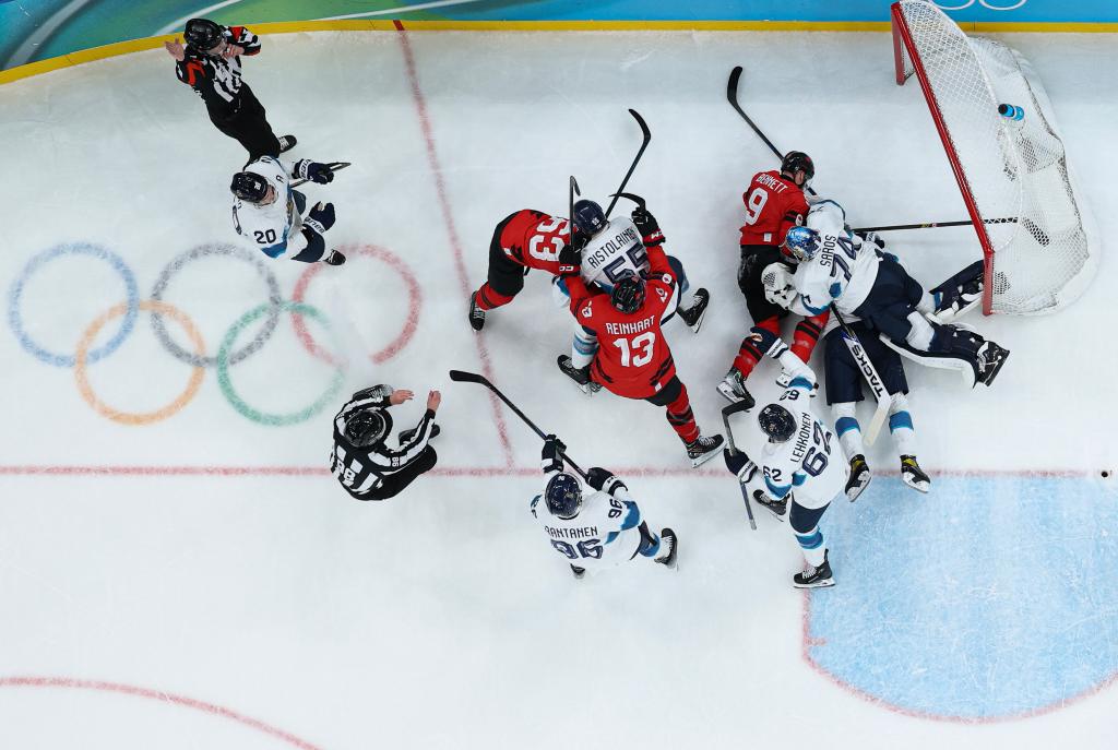 Players conflict during the ice hockey men's play-offs quarterfinal between Canada and Finland at the Milan-Cortina 2026 Olympic Winter Games in Milan, Italy, Feb. 20, 2026. (Xinhua/Zhang Haofu)