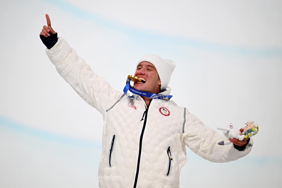 Gold medalist Alex Ferreira of the United States reacts during the awarding ceremony after the freestyle skiing men's freeski halfpipe final at the Milan-Cortina 2026 Olympic Winter Games in Livigno, Italy, Feb. 20, 2026. (Xinhua/Zhang Hongxiang)