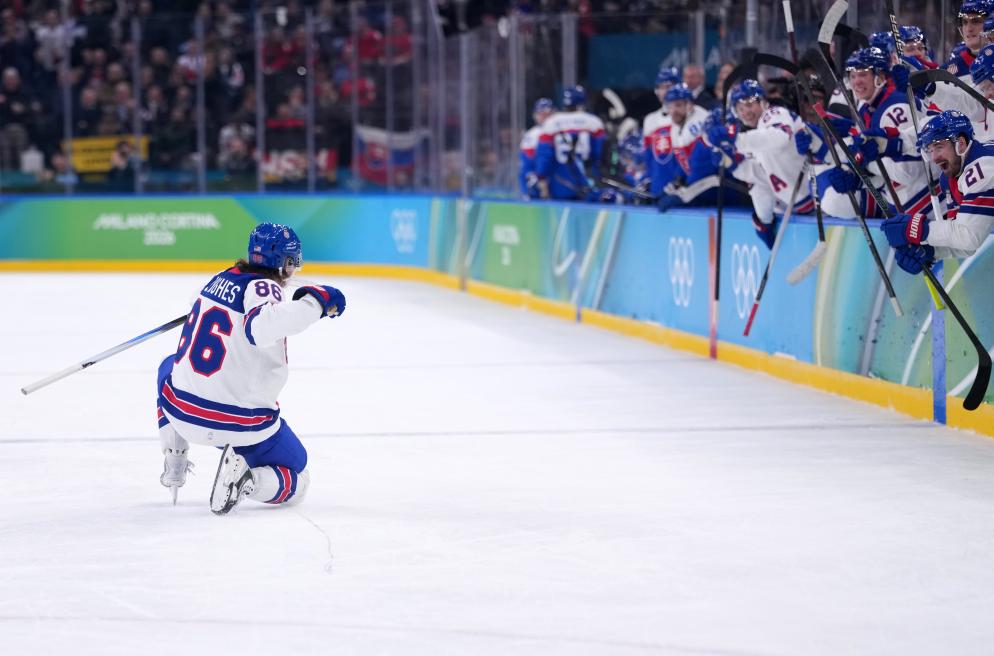 Jack Hughes (L) of the United States celebrate his goal during the ice hockey men's play-offs semifinal match between the United States and Slovakia at the Milan-Cortina 2026 Olympic Winter Games in Milan, Italy, Feb. 20, 2026. (Xinhua/Tao Xiyi)