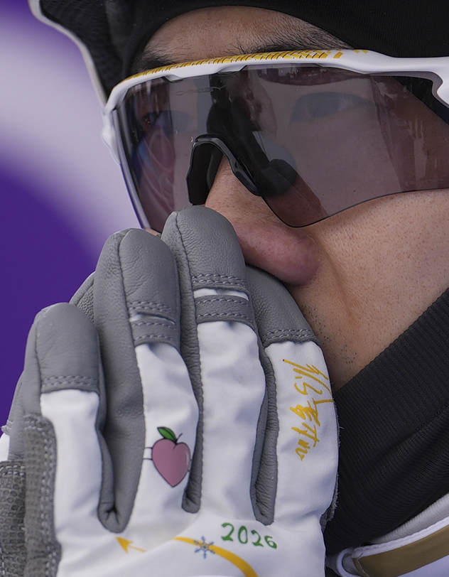 Wang Xindi of China reacts during the freestyle skiing men's aerials final 1 at the Milan-Cortina 2026 Olympic Winter Games in Livigno, Italy, Feb. 20, 2026. (Xinhua/Hu Chao)