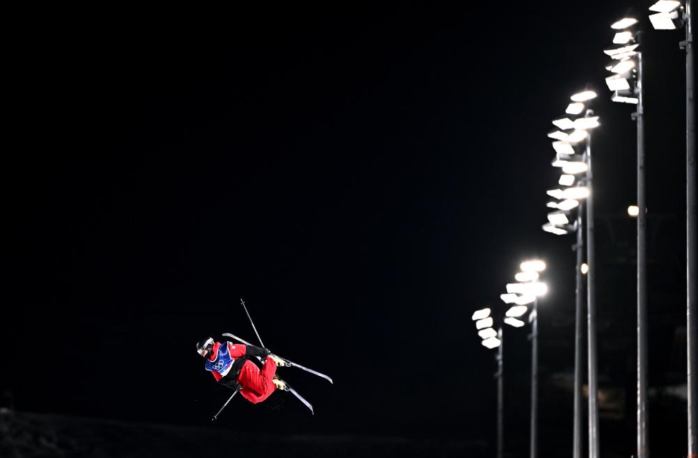 Wang Xindi of China competes during the freestyle skiing men's aerials final 2 at the Milan-Cortina 2026 Olympic Winter Games in Livigno, Italy, Feb. 20, 2026. (Xinhua/Hu Chao)