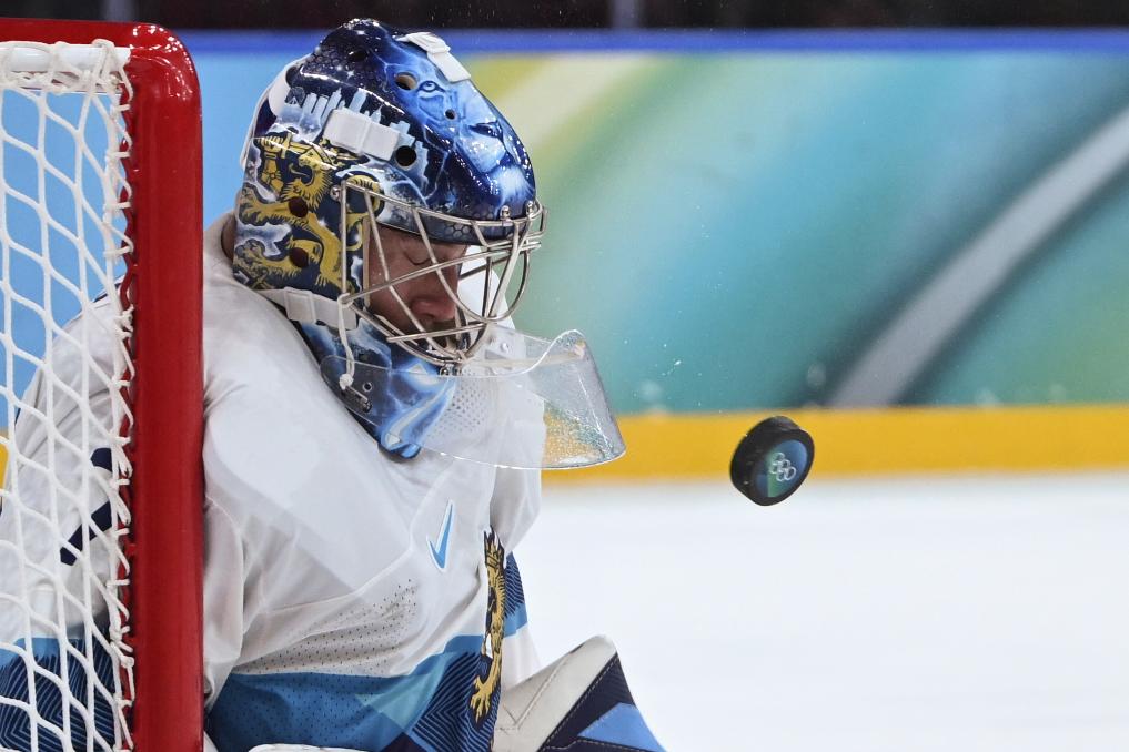Goalkeeper Juuse Saros of Finland reacts during the ice hockey men's play-offs quarterfinal between Canada and Finland at the Milan-Cortina 2026 Olympic Winter Games in Milan, Italy, Feb. 20, 2026. (Xinhua/Zhang Haofu)
