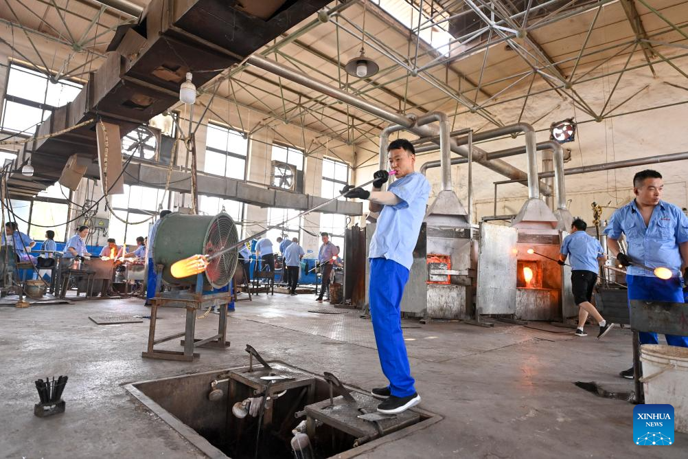 A staff member blows a piece of glassware at a glass enterprise in Qixian County, north China's Shanxi Province, June 12, 2025. (Xinhua/Yang Chenguang)