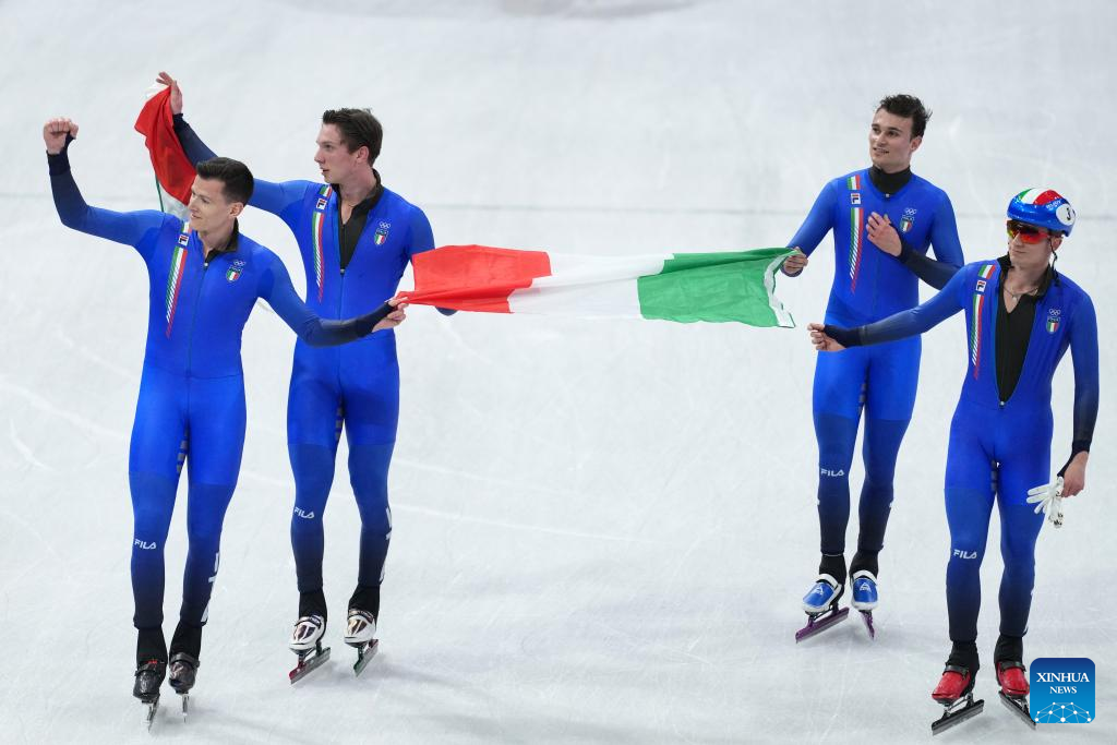 Athletes of Italy celebrate after the short track speed skating men's 5000m relay final A at the Milan-Cortina 2026 Olympic Winter Games in Milan, Italy, Feb. 20, 2026. (Xinhua/Xue Yuge)