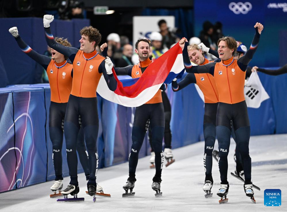 Athletes of Team Netherlands celebrate after the short track speed skating men's 5000m relay final A at the Milan-Cortina 2026 Olympic Winter Games in Milan, Italy, Feb. 20, 2026. (Xinhua/Xue Yuge)
