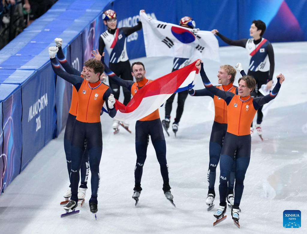 Athletes of Team Netherlands celebrate after the short track speed skating men's 5000m relay final A at the Milan-Cortina 2026 Olympic Winter Games in Milan, Italy, Feb. 20, 2026. (Xinhua/Cheng Min)