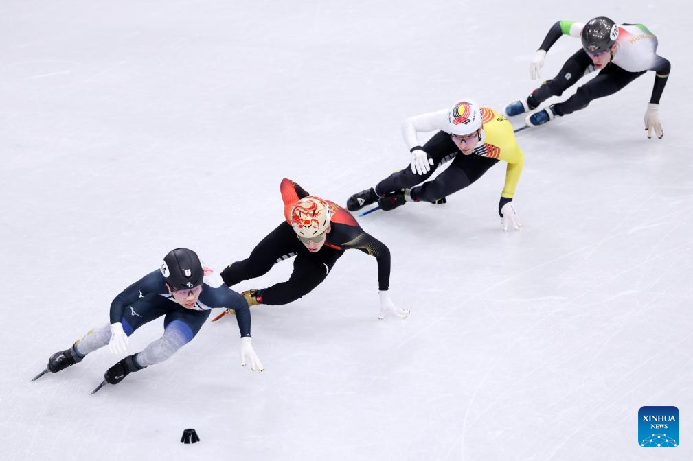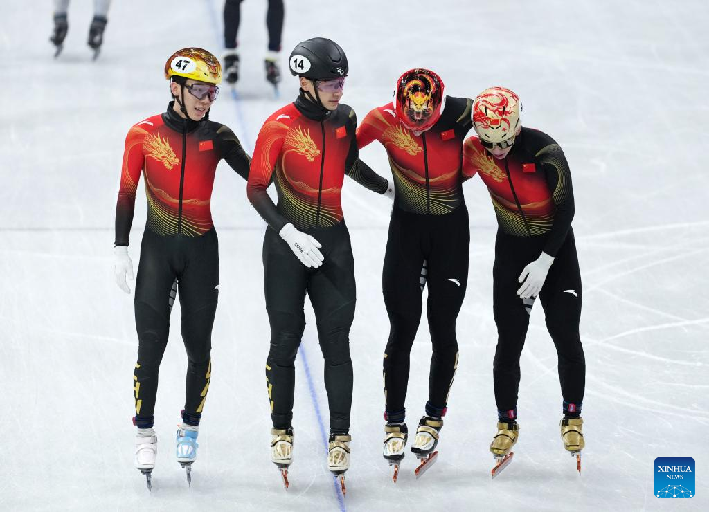 Lin Xiaojun (2nd L) of China competes during the short track speed skating men's 5000m relay final B at the Milan-Cortina 2026 Olympic Winter Games in Milan, Italy, Feb. 20, 2026. (Xinhua/Chen Yichen)