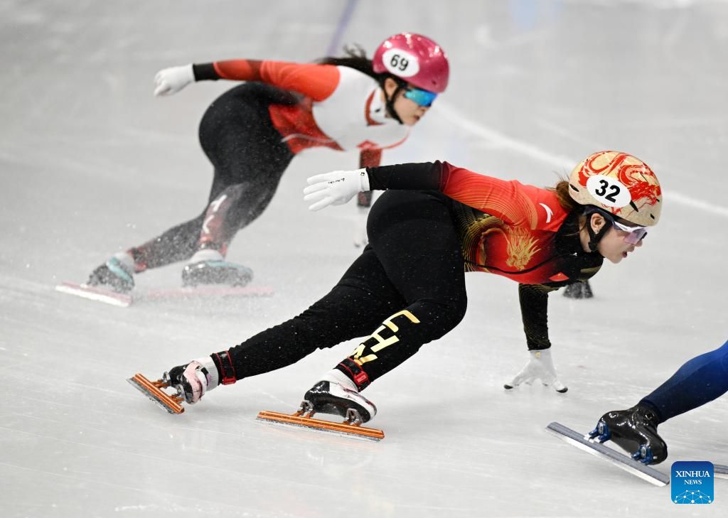 Yang Jingru (C) of China competes during the short track speed skating women's 1500m final A at the Milan-Cortina 2026 Olympic Winter Games in Milan, Italy, Feb. 20, 2026. (Xinhua/Cheng Min)