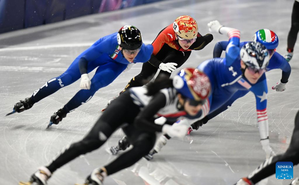 Athletes compete during the short track speed skating women's 1500m final A at the Milan-Cortina 2026 Olympic Winter Games in Milan, Italy, Feb. 20, 2026. (Xinhua/Chen Yichen)
