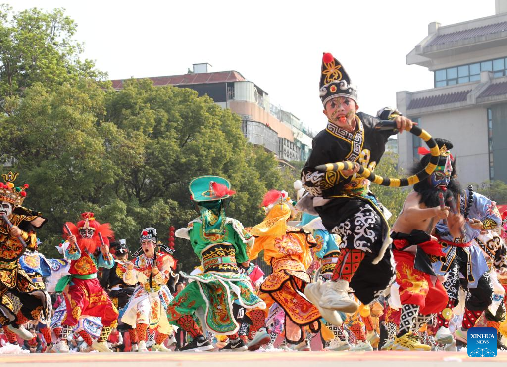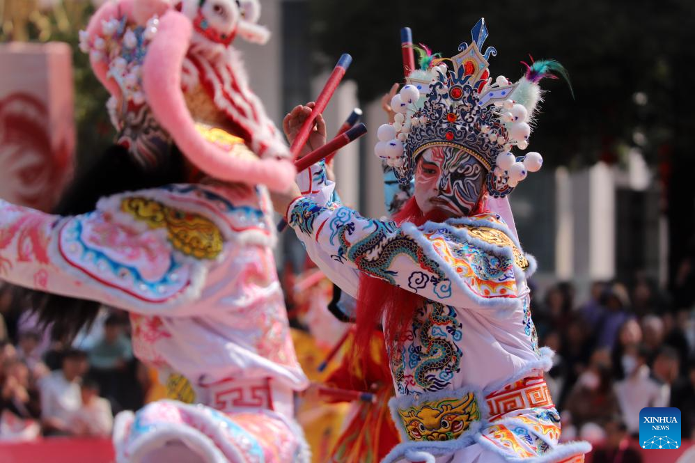 Artists perform during a Yingge dance carnival event celebrating the Spring Festival in Chaoyang District of Shantou, south China's Guangdong Province, Feb. 21, 2026. During the Spring Festival holiday, many Yingge dance teams have staged wonderful performances across China.