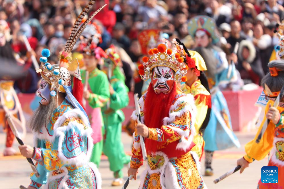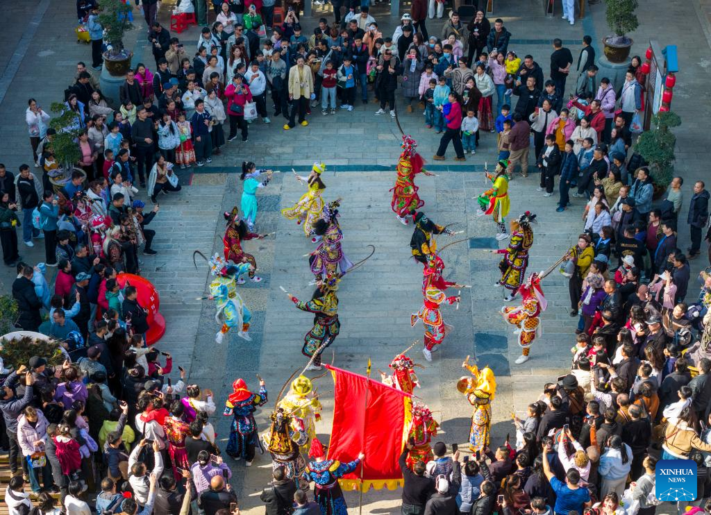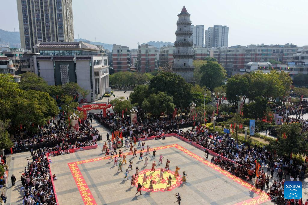 A drone photo taken on Feb. 21, 2026 shows artists performing during a Yingge dance carnival event celebrating the Spring Festival in Chaoyang District of Shantou, south China's Guangdong Province. During the Spring Festival holiday, many Yingge dance teams have staged wonderful performances across China.