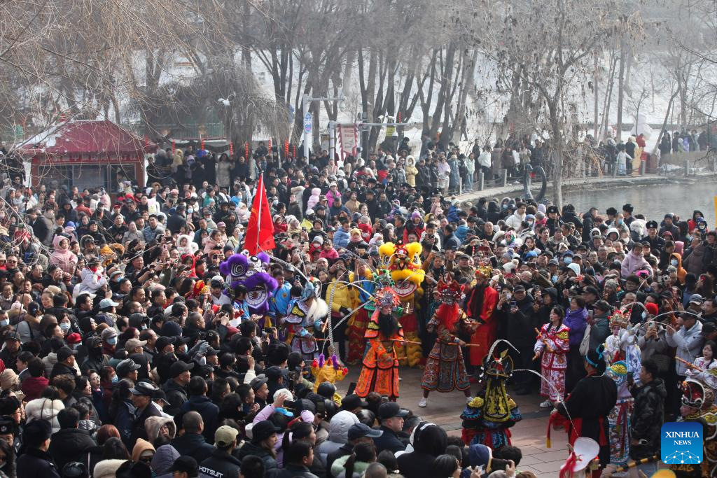 People watch a Yingge dance performance in Shuimogou District of Urumqi, northwest China's Xinjiang Uygur Autonomous Region, Feb. 21, 2026. During the Spring Festival holiday, many Yingge dance teams have staged wonderful performances across China.