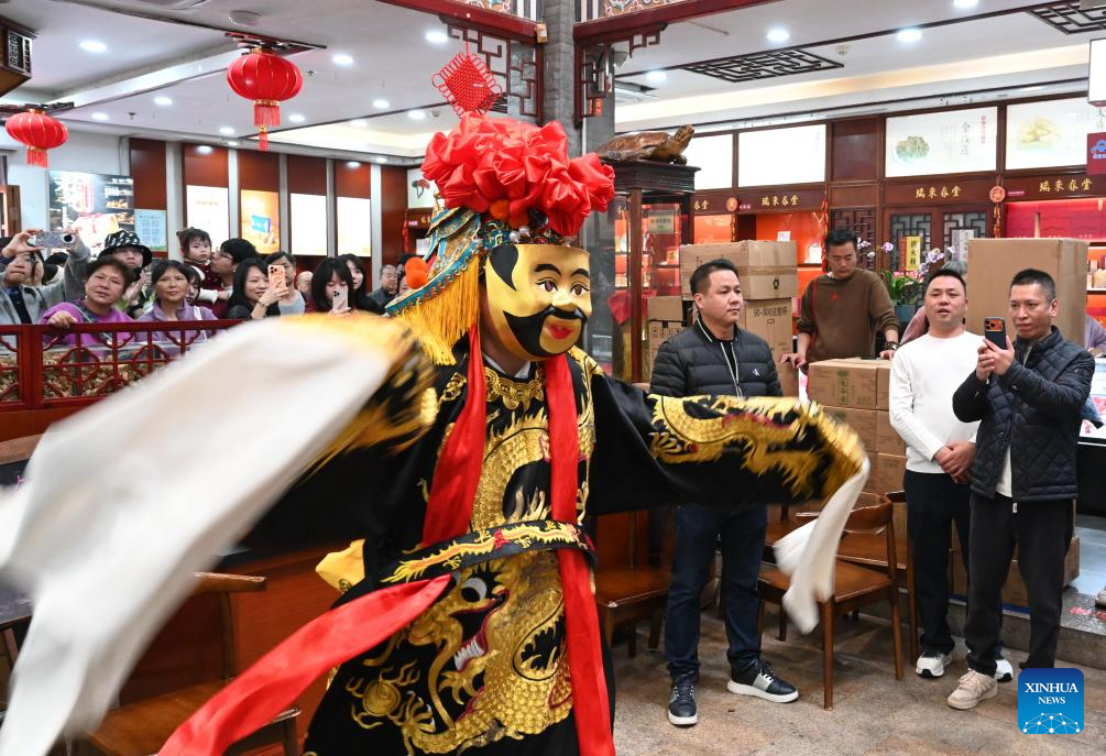 A folk activity to receive the "Gods of Wealth" is held at a traditional Chinese medicine clinic in the historic and cultural city block Three Lanes and Seven Alleys in Fuzhou, southeast China's Fujian Province, Feb. 21, 2026. Folk events were held here on Saturday to receive the "Gods of Wealth," a tradition to celebrate the fifth day of the Chinese New Year, or the Spring Festival. (Xinhua/Lin Shanchuan)