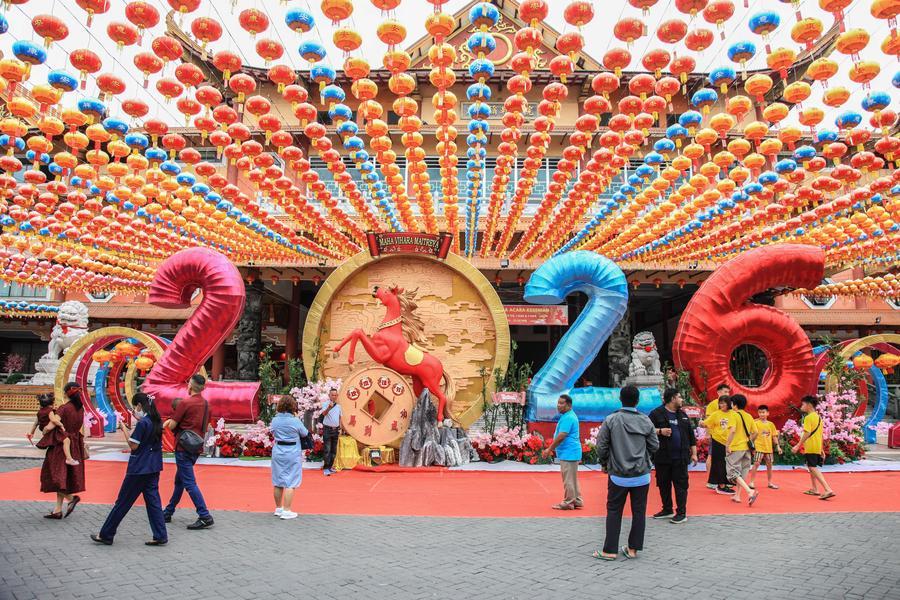 People walk past an installation celebrating the Chinese New Year in Medan, North Sumatra, Indonesia, Feb. 17, 2026. (Photo by Alberth Damanik/Xinhua)