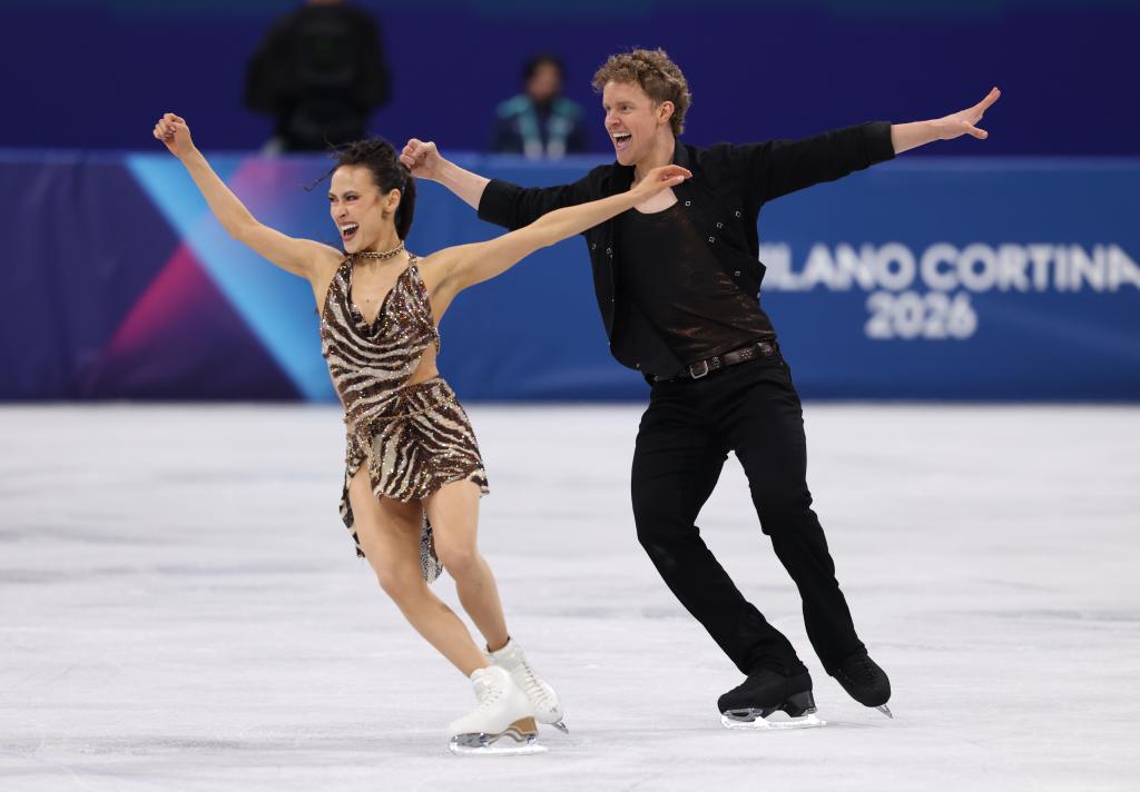 Madison Chock (L)/Evan Bates of the United States perform during the rhythm dance of figure skating ice dance competition at the Milan-Cortina 2026 Olympic Winter Games in Milan, Italy, Feb. 9, 2026. (Xinhua/Chen Yichen)