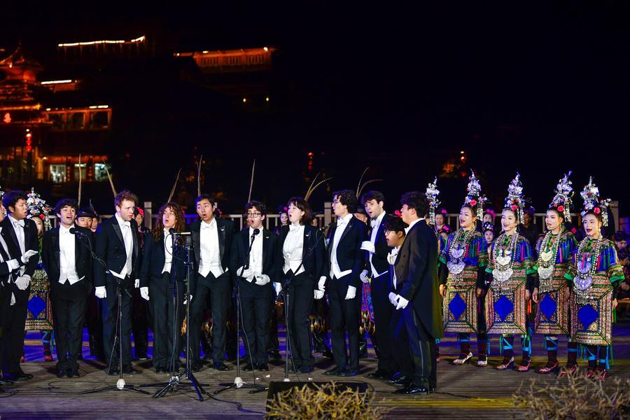 GUIYANG/CHONGQING, March 30 (Xinhua) -- Set within the natural amphitheater of the Tianshengqiao Bridge -- a centuries-old limestone arch in southwest China's Guizhou Province -- the resonant harmonies of traditional Dong ethnic songs intertwined with the crisp melodies of an American a cappella group, their unamplified voices blending beneath the stone.