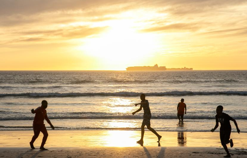People have fun on Sunset Beach in Cape Town, South Africa