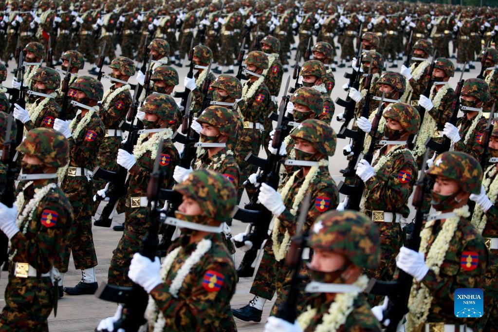 Soldiers march in a formation during a military parade to mark the 77th Armed Forces Day in Nay Pyi Taw, capital of Myanmar, March 27, 2022. Myanmar marked the 77th Armed Forces Day with a military parade in the capital city of Nay Pyi Taw on Sunday. (Xinhua/U Aung)