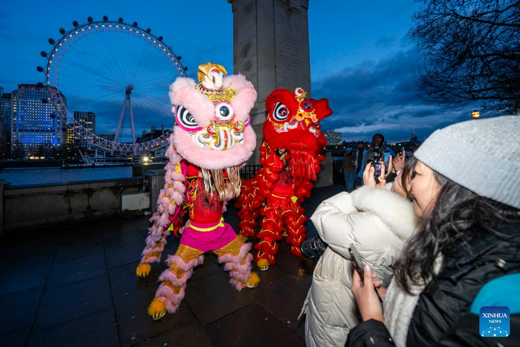 Traditional Chinese lion dancers perform in front of the London Eye which is lit up in red to celebrate the Chinese New Year in London, Britain, Feb. 16, 2026. (Photo by Stephen Chung/Xinhua)
