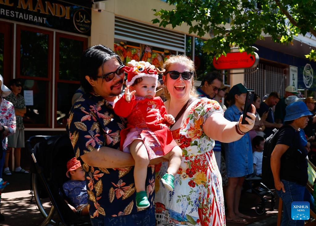Visitors take a selfie during an event celebrating the Spring Festival in Canberra, Australia, Feb. 21, 2026. (Photo by Chu Chen/Xinhua)