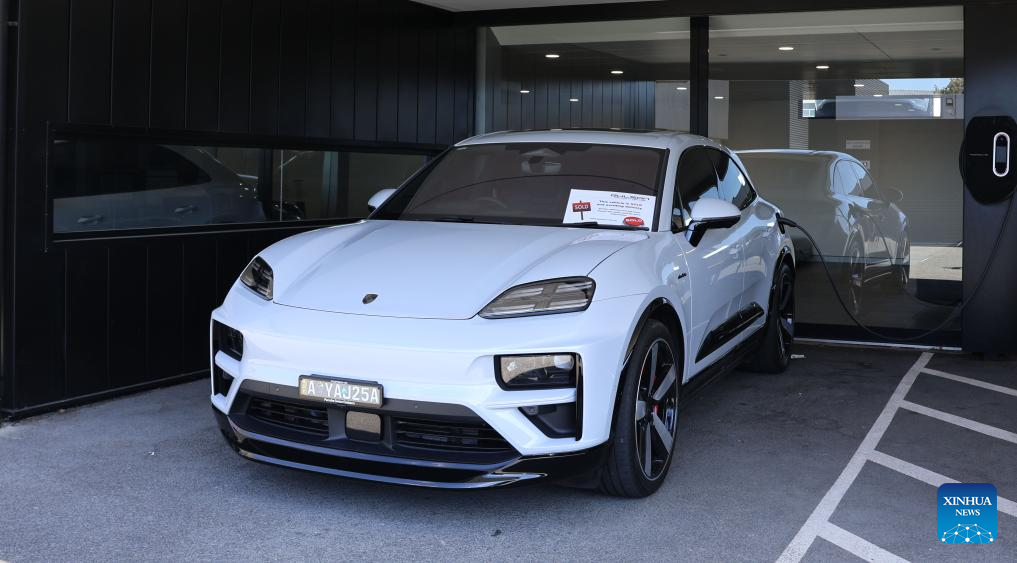 An electric vehicle, which has just been sold, charges at a dealership before delivery in Canberra, Australia, on April 8, 2026. (Photo by Zhang Na/Xinhua)