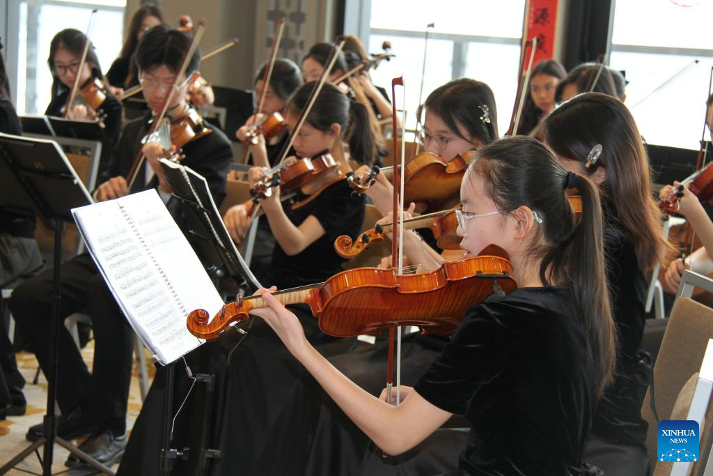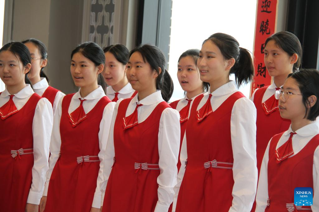 Students of the Art Troupe of the High School affiliated to Renmin University of China perform during an event to celebrate the Chinese New Year in Muscatine, Iowa, the United States, on Feb. 14, 2026. Around 60 residents in Muscatine, a town on the Mississippi River in Iowa, gathered in the ballroom of the Merrill Hotel on Saturday to celebrate the upcoming Chinese Lunar New Year -- the Year of the Horse. (Xinhua/Xu Jing)