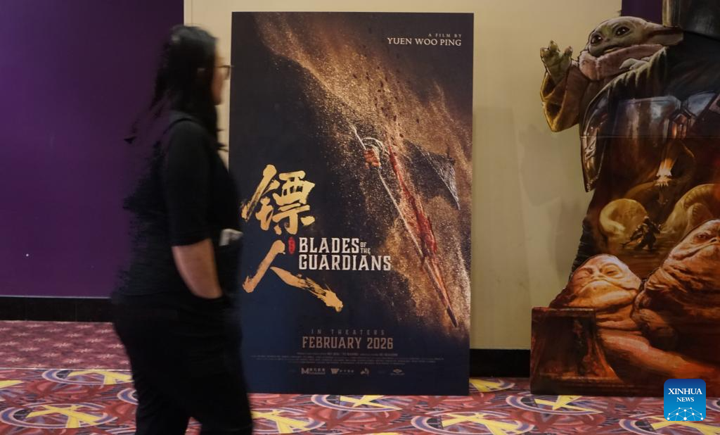 A moviegoer walks past a poster of "Blades of the Guardians," a film directed by legendary action choreographer Yuen Woo-ping, at a cinema in Monterey Park, Los Angeles County, California, the United States, Feb. 17, 2026. Multiple Chinese films are set for release in North America during the period of Chinese New Year, also known as the Spring Festival, including two highly-anticipated blockbusters premiering Tuesday, the Chinese Lunar New Year's Day.(Photo by Zeng Hui/Xinhua)
