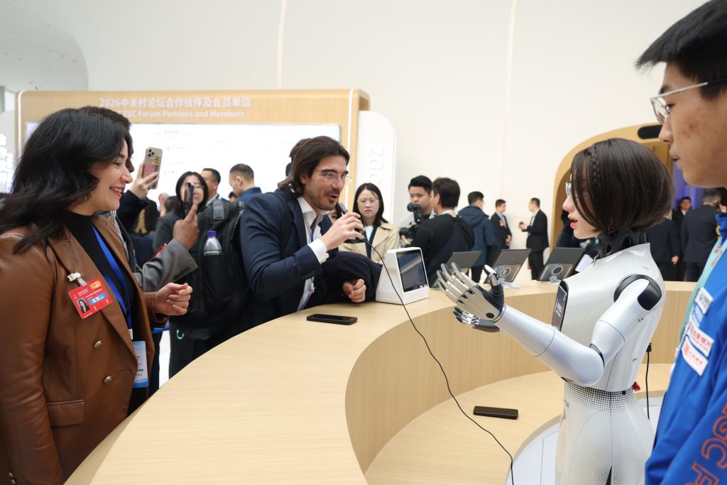 3月25日,在中关村国际创新中心,嘉宾与迎宾机器人“小诺”互动。