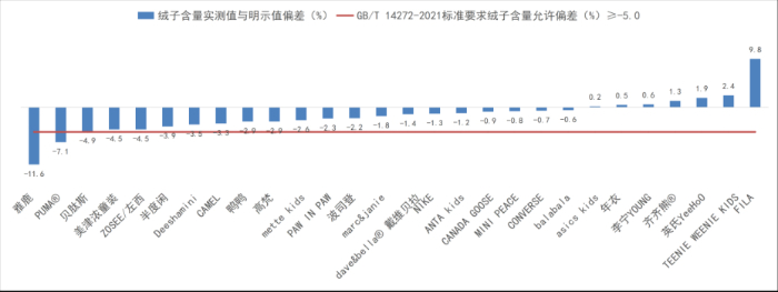 图2 28款儿童羽绒服样品绒子含量实测值与明示值偏差结果