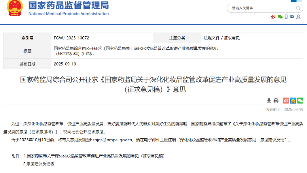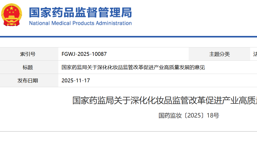 國家藥監(jiān)局關(guān)于深化化妝品監(jiān)管改革促進(jìn)產(chǎn)業(yè)高質(zhì)量發(fā)展的意見 國藥監(jiān)妝〔2025〕18號