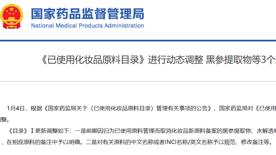 《已使用化妝品原料目錄》進(jìn)行動態(tài)調(diào)整 黑參提取物等3個原料按照已使用原料管理