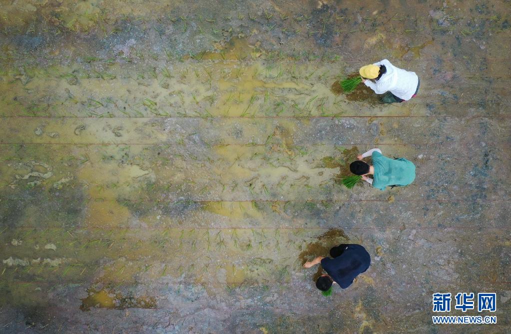 研究人員在廣州增城華南農(nóng)業(yè)大學(xué)試驗(yàn)田插種嫦娥五號(hào)搭載的太空稻秧苗(2021年3月29日攝,無(wú)人機(jī)照片)。共計(jì)40克的“天稻”于2020年11月搭乘嫦娥五號(hào)登月,歷時(shí)約23天、76萬(wàn)公里的“環(huán)月旅行”返回地球。