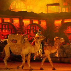 “出发喽!”随着驼夫号子响起,几峰驮着货物的骆驼从驿站前缓缓走过,后面跟着挑扁担的货郎和推小车的工匠。一支走西口的商队,从历史深处走来,走到莫尼山非遗小镇,为游客呈现了一场沉浸式实景剧《莫尼山礼赞》。