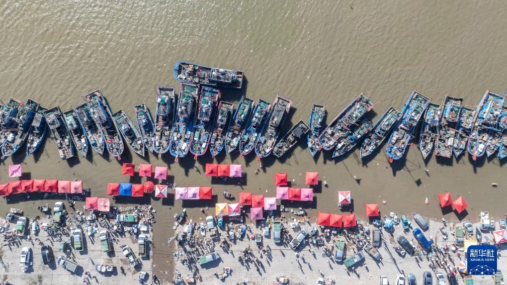 9月8日,满载而归的渔船停靠在河北省唐山市丰南区黑沿子中心渔港码头(无人机照片)。