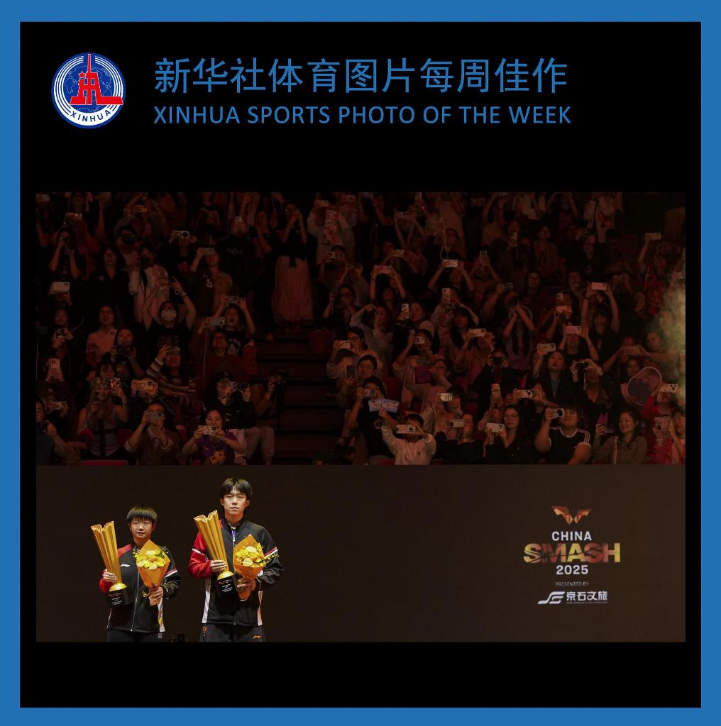 103日,在北京举行的2025年世界乒乓球职业大联盟(WTT)中国大满贯赛混合双打决赛后,冠军中国组合王楚钦(右)/孙颖莎在颁奖仪式上。