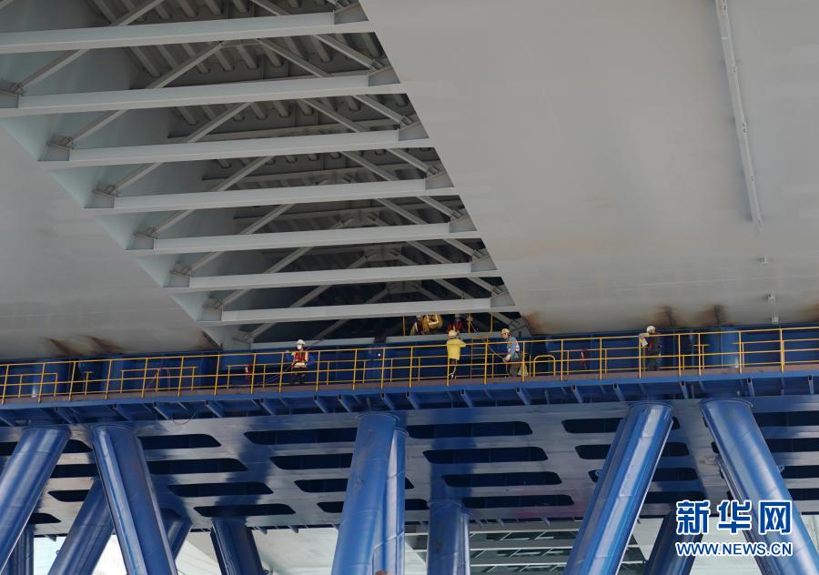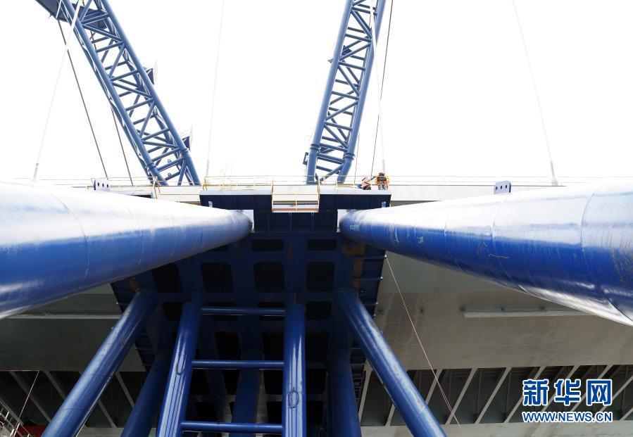 “冒出來”的并不是一座完整的大橋,而是一段跨徑長達(dá)200米的雙拱鋼橋,在海面中央兀然矗立?!斑@是我們大橋工程最核心的主橋部分,技術(shù)難度最大,對整個(gè)項(xiàng)目有里程碑的意義?!背薪▎挝恢袊窐蚬こ逃邢薰径?、項(xiàng)目總指揮闞軍說。