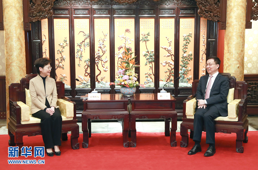 3月6日,中共中央政治局常委、國務院副總理韓正在北京釣魚臺國賓館會見香港特別行政區(qū)行政長官林鄭月娥。新華社記者 龐興雷 攝