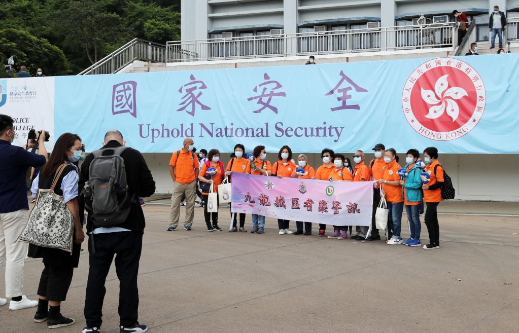 2021年4月15日,在香港警察學(xué)院,香港市民在全民國(guó)家安全教育日活動(dòng)上合影留念。新華社記者 李鋼 攝