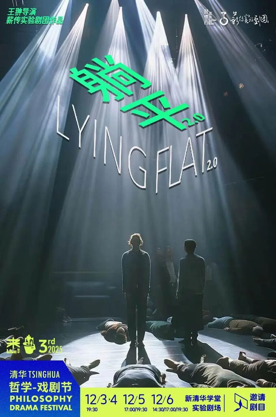 《躺平2.0》是第三届清华哲学-戏剧节的邀请剧目之一。让哲学思想穿过书本和课堂,来到剧场获得鲜活生命力。思想进入到公共空间,与更多人发生真实的连接;剧场成为激发想象与创造的场所,让哲思得以被看见、被感受。