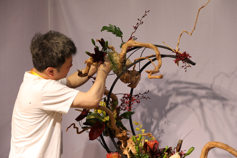 “輕攏慢捻抹復(fù)挑,插花也如琵琶語?!庇浾咴诂F(xiàn)場看到,選手們沉浸在插花藝術(shù)創(chuàng)作中,鮮花、枝葉在他們的手中經(jīng)過一番規(guī)整修剪,又如繪畫般慎重落下一抹畫筆,嬌艷綻放的鮮花在新的布局下,逐漸呈現(xiàn)出定格的自然之美、線條之美與意境之美,花藝設(shè)計(jì)本身的創(chuàng)作過程,就是一場賞心悅目的藝術(shù)呈現(xiàn),人和花交流的過程,也會讓人們更加能夠體會到生命的真實(shí)與絢爛。