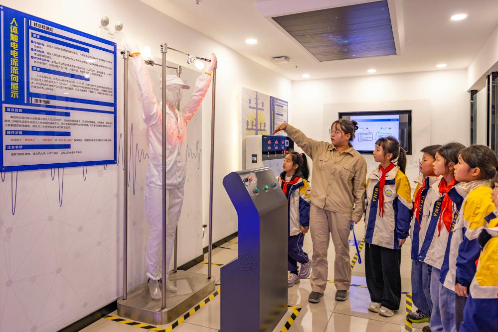 3月30日,工作人员在江苏省泰州市儿童友好实践基地通过模拟人及LED灯带显示的人体触电电流流向展示图给海陵区九龙实验学校学生讲解预防触电安全措施。