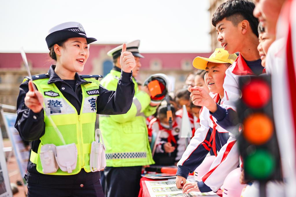 3月30日,天津市公安局滨海分局交通管理支队民警在天津市滨海新区塘沽贻成小学以互动方式为学生讲解道路交通安全知识。